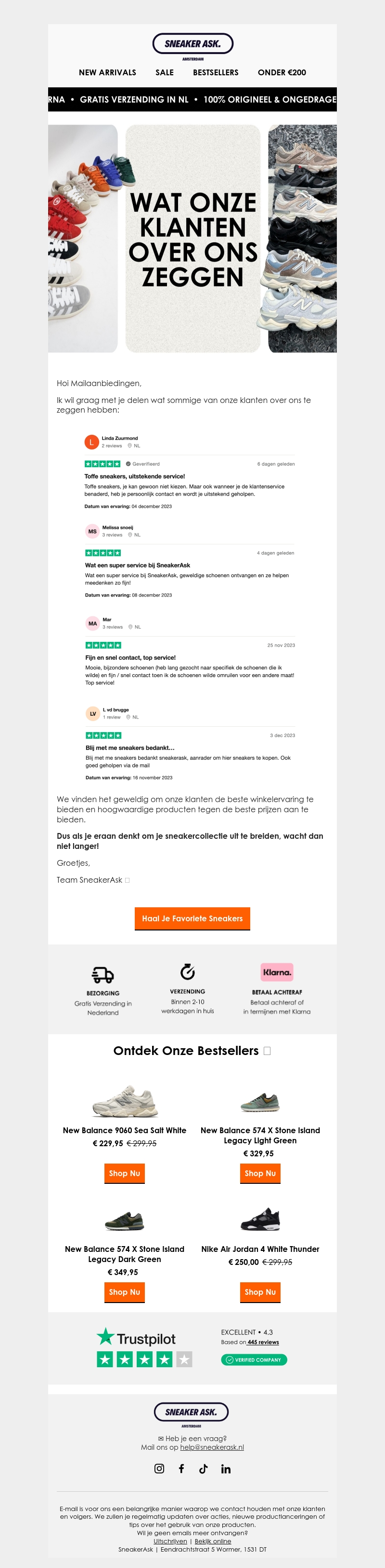 Lees wat onze tevreden klanten te zeggen hebben over SneakerAsk. Van geweldige klantenservice tot de beste selectie sneakers, ontdek waarom klanten voor ons kiezen. Nu ook gratis verzending en achteraf betalen met Klarna!