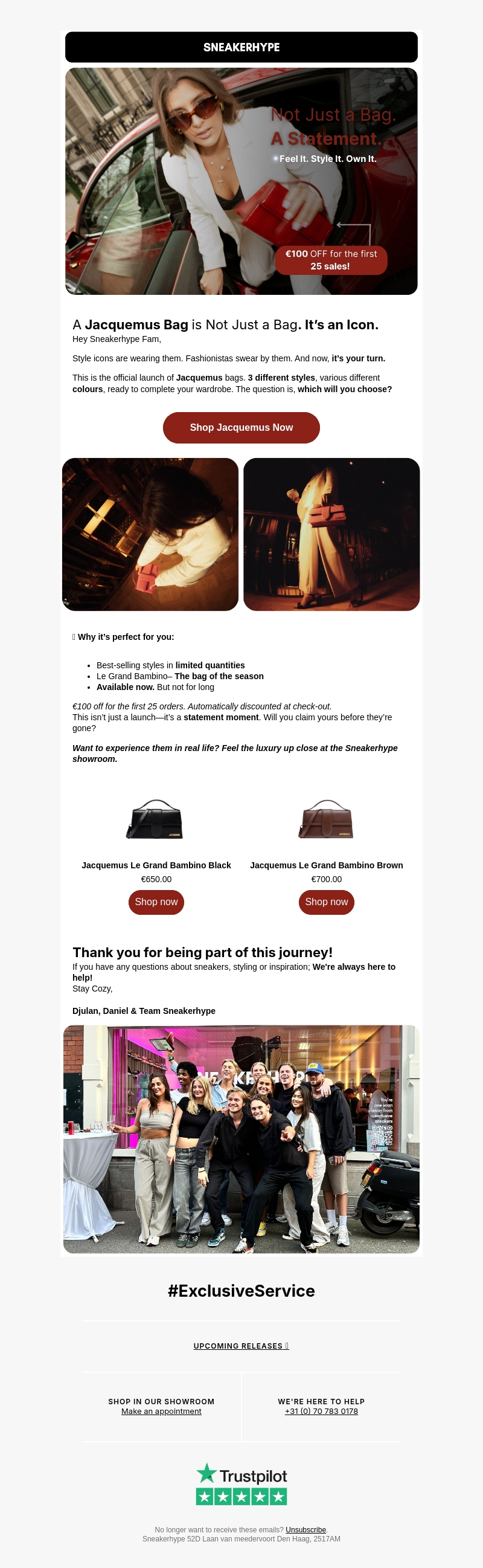 Ervaar de stijl en elegantie van de nieuwe Jacquemus tassen. Met drie verschillende stijlen en kleuren vind je de perfecte aanvulling voor elke outfit. Profiteer van β¬100 korting op de eerste 25 aankopen. Bezoek onze showroom voor een exclusieve ervaring. Grijp je kans voor deze limited edition items uitverkocht zijn.