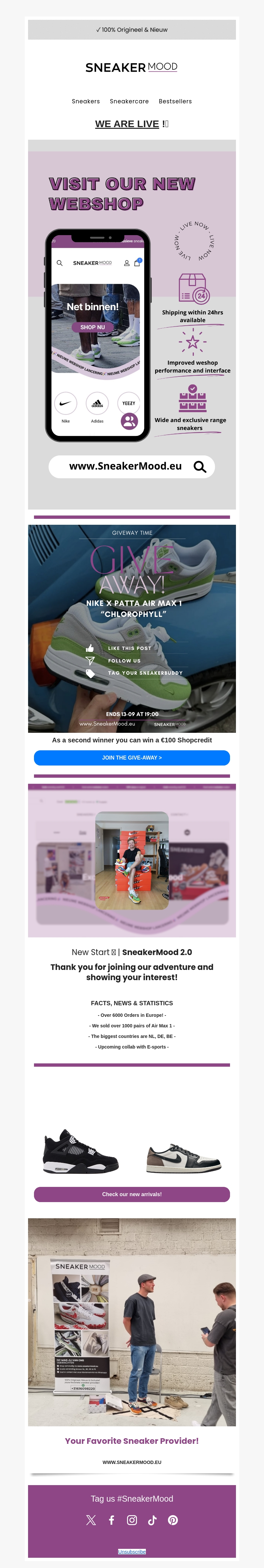 Onze nieuwe webshop is live! Bezoek ons nu op www.SneakerMood.eu voor de beste sneakers en exclusieve aanbiedingen. Doe mee aan onze giveaway en maak kans op een Nike x Patta Air Max 1 'Chlorophyll' en €100 shoptegoed. Bedankt voor jullie steun en vertrouwen in SneakerMood!