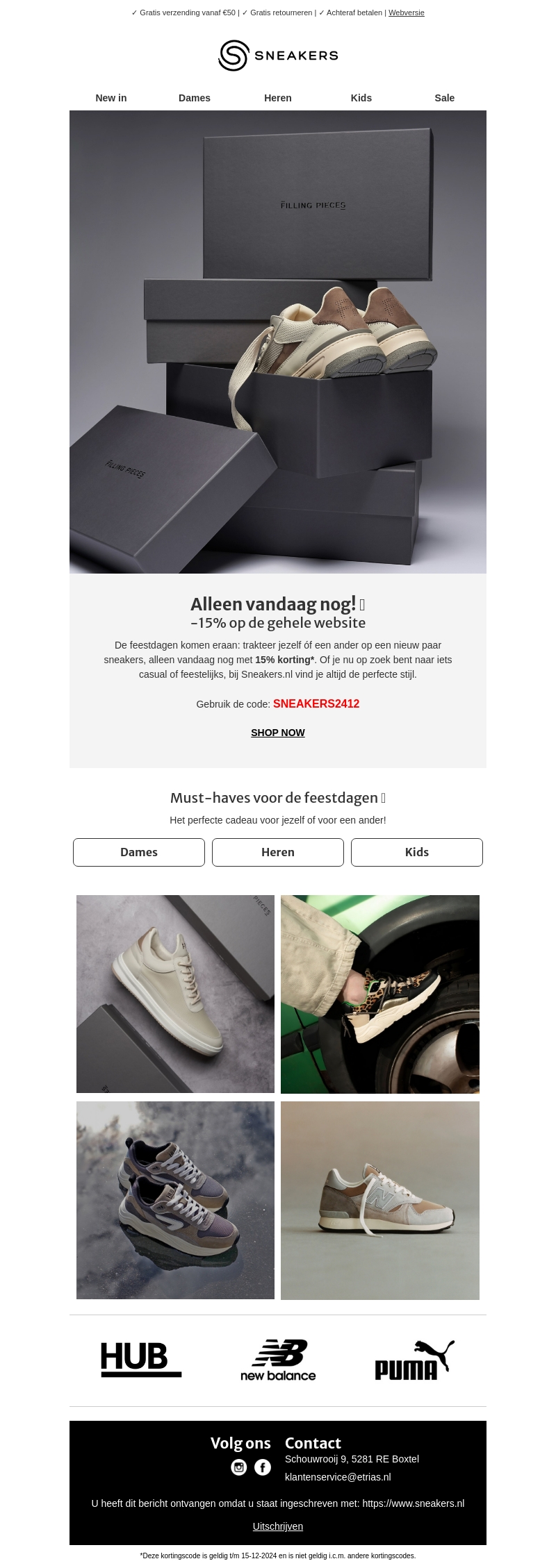 Mis deze unieke kans niet voor de feestdagen! Slechts vandaag krijg je 15% korting op de gehele website van Sneakers.nl. Of je nu op zoek bent naar dames-, heren- of kindersneakers, er is voor ieder wat wils. Verwen jezelf of verras een ander met de perfecte paar schoenen. Gebruik de kortingscode SNEAKERS2412 en shop jouw nieuwe favoriete paar sneakers. Laat de feestdagen stijlvol beginnen!