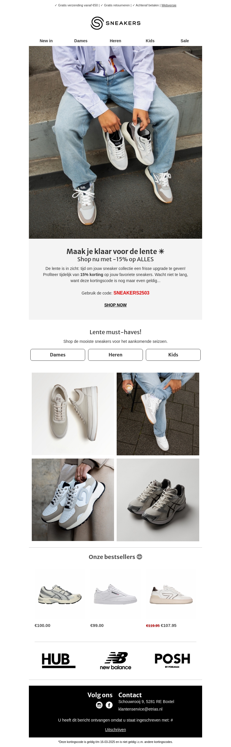 Deze week biedt SNEAKERS een exclusieve 15% korting op alle producten. Upgrade je collectie met de nieuwste stijlen voor dames, heren en kinderen. Gebruik de kortingscode SNEAKERS2503 voor uw aankoop. Deze aanbieding is slechts tijdelijk, dus sla snel je slag! Bekijk onze bestseller selectie voor meer inspiratie.