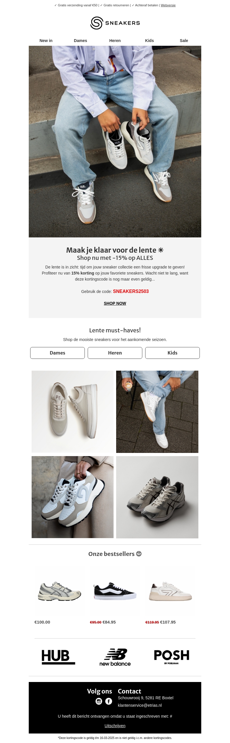 Bereid je voor op de lente met een frisse sneakercollectie! Profiteer van 15% korting op al jouw favoriete schoenen. Gebruik de kortingscode SNEAKERS2503 voor een beperkte tijd. Bekijk een selectie van dames-, heren-, en kindersneakers. Zorg ervoor dat je niets mist van deze geweldige lente-aanbieding!