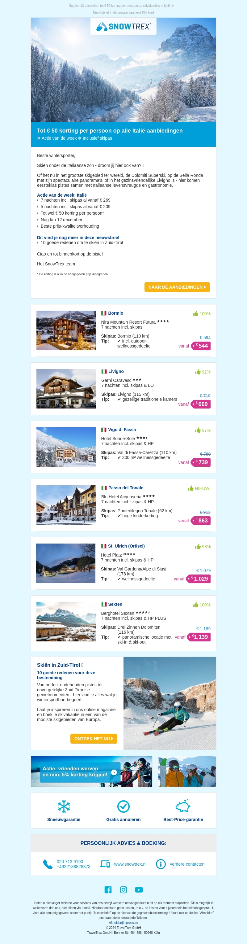 Geniet van skiën onder de Italiaanse zon met onze exclusieve aanbiedingen. Boek nu je skivakantie naar populaire bestemmingen zoals Bormio, Livigno en St. Ulrich met €50 korting per persoon. Dit is de ideale kans om de prachtige Dolomieten te verkennen.