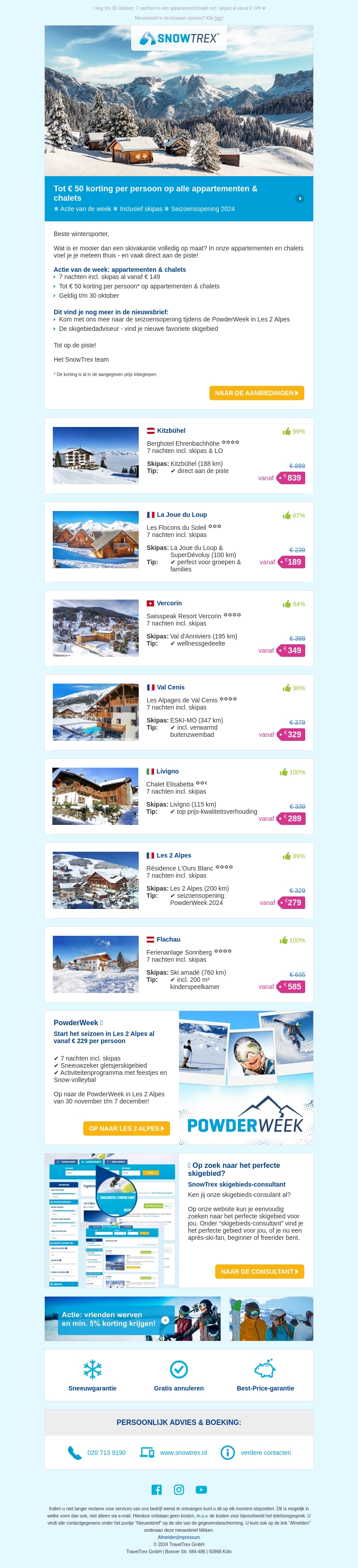 Ontdek aantrekkelijke kortingen tot 50 euro op diverse appartementen en chalets van SnowTrex. Of je nu op zoek bent naar een gezellige plek dicht bij de piste of een ruim verblijf voor het hele gezin, er is voor ieder wat wils. Vind jouw ideale skivakantie in topbestemmingen zoals Kitzbühel en Les 2 Alpes. Reserveer nu en profiteer van de seizoensopening aanbiedingen. Bereid je voor op een onvergetelijke winterervaring!