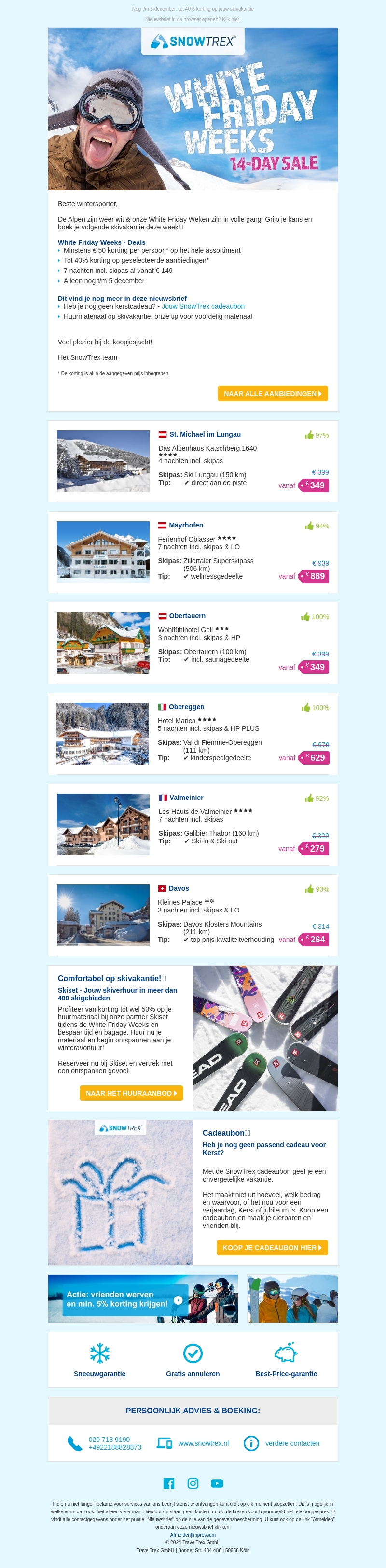 Maak gebruik van de geweldige White Friday Weeks deals bij SnowTrex. Profiteer van kortingen tot 50% op je skivakantie en ontdek aanbiedingen vanaf slechts €149. Boek snel, want deze aanbiedingen gelden tot en met 5 december. Kies uit diverse bestemmingen zoals St. Michael im Lungau en Mayrhofen en geniet van een onvergetelijke winterervaring.