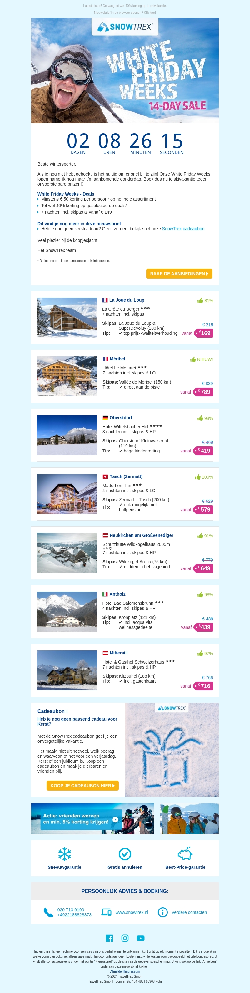 De White Friday Weeks zijn in volle gang met geweldige ski-aanbiedingen bij SnowTrex. Met kortingen van wel 40%, is dit de perfecte tijd om je wintersport te boeken. Geniet van voordelige prijzen voor populaire skibestemmingen. Of je nu op zoek bent naar luxe overnachtingen of betaalbare skipassen, SnowTrex heeft voor ieder wat wils. Mis deze kans niet en plan je winteruitje vandaag nog. Actie duurt nog maar 2 dagen!