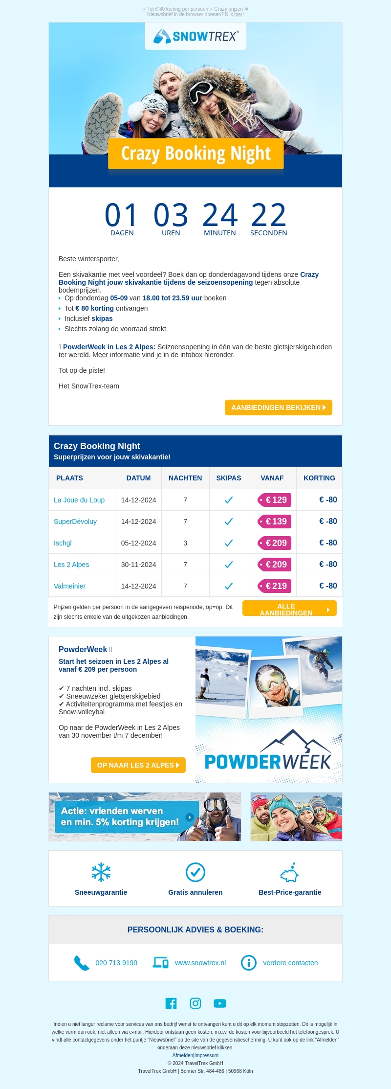 Beste wintersporter, mis deze kans niet. Boek jouw skivakantie tijdens de Crazy Booking Night en profiteer van ongelofelijke kortingen tot wel €80. Verzeker je plek en geniet van een geweldige winterervaring inclusief skipas. Dit aanbod geldt alleen op 5 september van 18:00 tot 23:59 uur. Wees er snel bij, want op is op!
