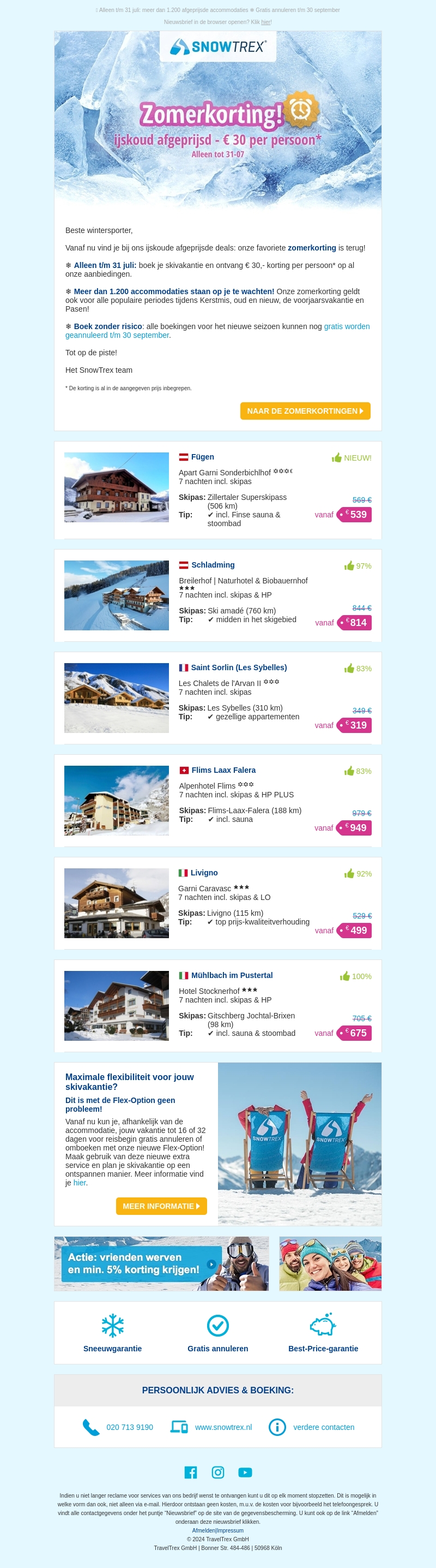 Beste wintersporter, grijp nu je kans met onze zomerkorting! Alleen tot 31 juli ontvang je €30 korting per persoon op alle skivakanties. Boek met vertrouwen dankzij onze risicoloze boeking en geniet van meer dan 1.200 accommodaties. Mis deze koude aanbieding niet!