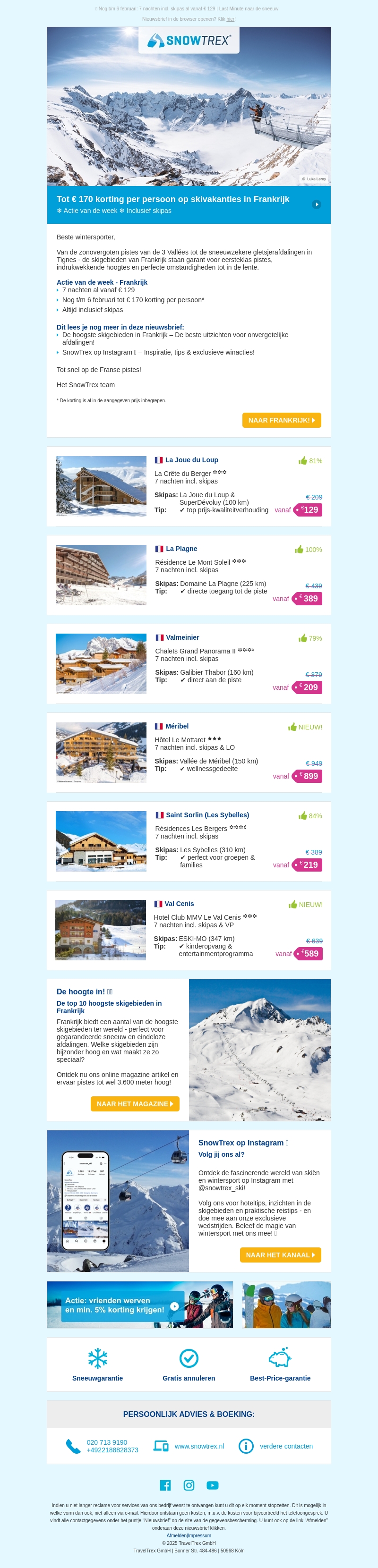 Ontdek de beste skivakantiedeals in Frankrijk met kortingen tot wel €170 per persoon. Geniet van de prachtige Franse pistes, inclusief skipas! Kies uit populaire locaties zoals La Plagne, Valmeinier en meer. Mis deze kans niet om de sneeuw te verkennen tegen een fantastische prijs. Boek snel uw winteravontuur.
