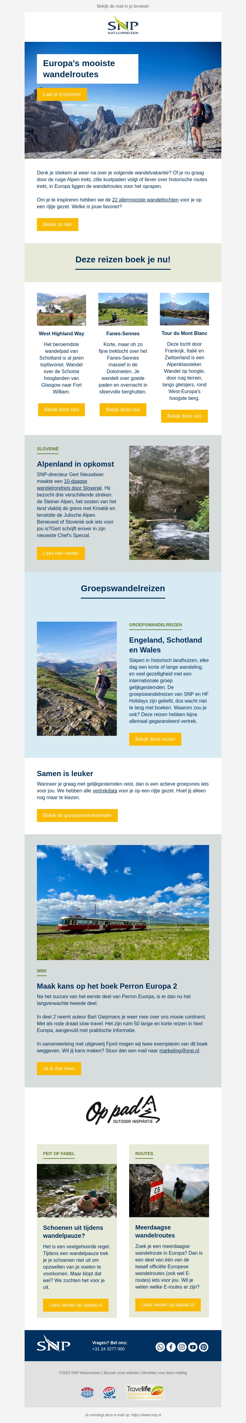 Ontdek de mooiste wandelroutes van Europa, van de Alpen tot Schotland. SNP neemt je mee op een avontuur langs adembenemende landschappen. Doe mee en maak kans op het inspirerende boek Perron Europa 2. Reserveer vandaag nog je plek en beleef onvergetelijke wandelingen. Mis deze kans niet!