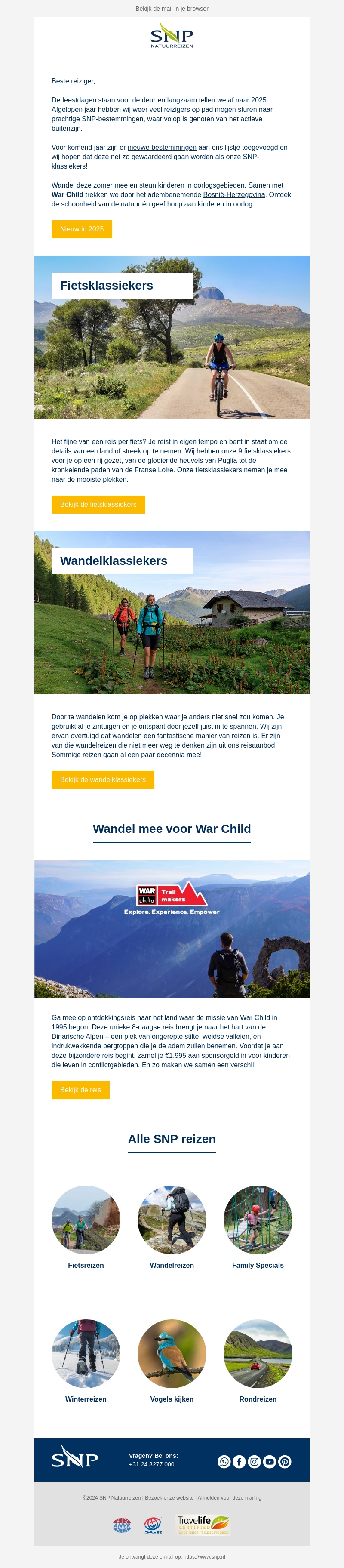 Verken de nieuwste fiets- en wandelklassiekers van SNP voor 2025. Ontdek prachtige bestemmingen met onze begeleide reizen en ondersteun een goed doel met War Child. Geniet van ongerepte natuur, rustige valleien en adembenemende uitzichten. Til je reiservaring naar een hoger niveau en draag bij aan een betere wereld.
