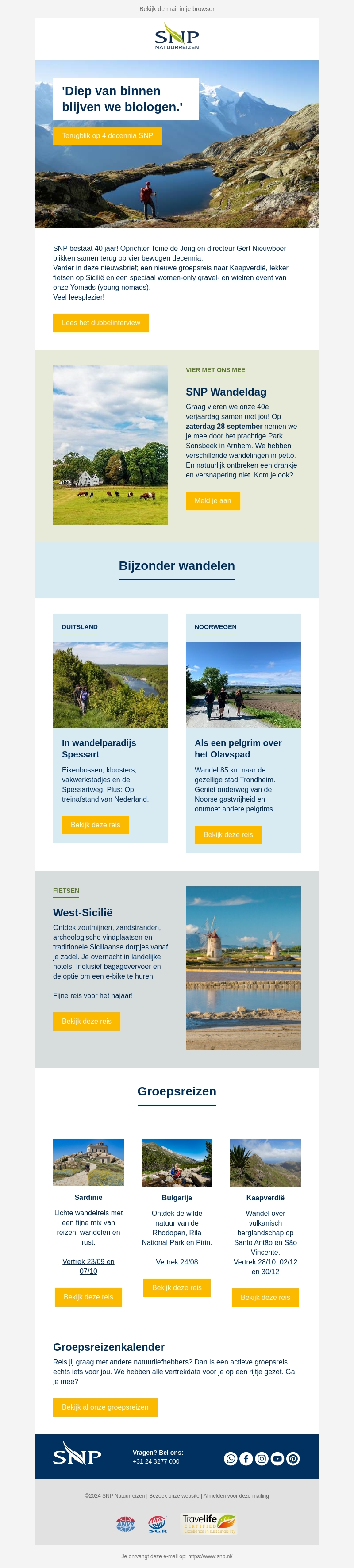 SNP bestaat 40 jaar! Oprichter Toine de Jong en directeur Gert Nieuwboer blikken terug op vier decennia van avontuur. Vier dit jubileum met hen op 28 september in Park Sonsbeek, met verschillende wandelingen en een drankje. Kom je ook?