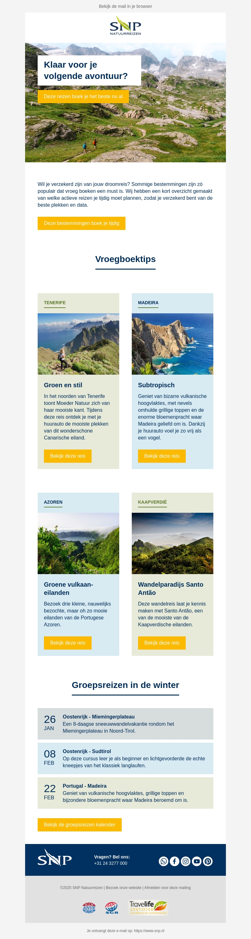 Wil je verzekerd zijn van jouw droomreis? Ontdek de beste bestemmingen en vroegboektips voor avonturen in Tenerife, Madeira, de Azoren en Kaapverdië. Plan je actieve reis op tijd voor de mooiste plekken en data. Boek nu je avontuur met SNP Natuurreizen.