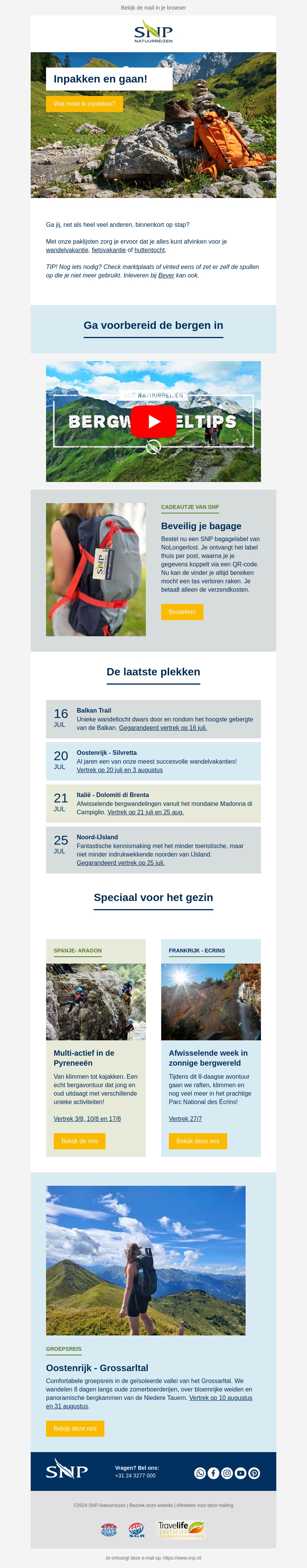 Ga goed voorbereid op reis met SNP Natuurreizen. Ontdek onze handige paklijsten voor verschillende vakantietypes zoals wandelvakanties en huttentochten. Profiteer van de laatste reisaanbiedingen naar prachtige bestemmingen zoals de Dolomieten en de Pyreneeën. Krijg tips voor een veilige en georganiseerde reis.