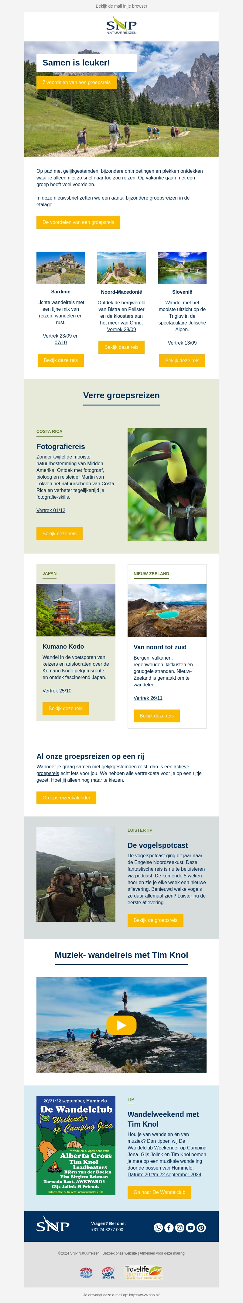 Ontdek waarom samen reizen zoveel leuker is! In deze nieuwsbrief lichten we 7 voordelen van een groepsreis uit en bieden we een selectie bijzondere verre groepsreizen aan. Van de prachtige natuur van Costa Rica tot het muzikale wandelweekend met Tim Knol, er is voor ieder wat wils. Bekijk de reizen en plan je volgende avontuur!