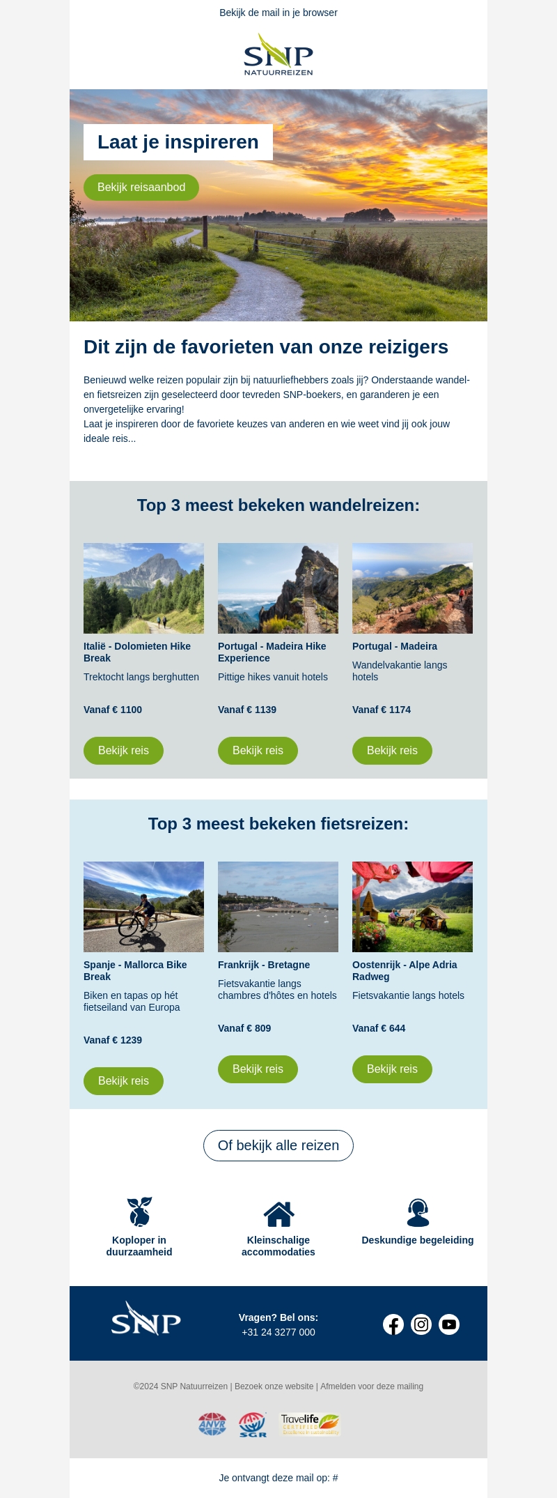 Laat je inspireren door de reiservaringen van anderen. SNP presenteert de top drie populairste wandel- en fietsreizen. Of je nu houdt van bergachtige hikes in de Dolomieten of fietsvakanties in Mallorca, wij hebben iets voor elke natuurliefhebber. Geniet van de pittoreske landschappen en de lokale gastvrijheid. Boek vandaag nog je avontuurlijke trip en beleef een onvergetelijke reis.