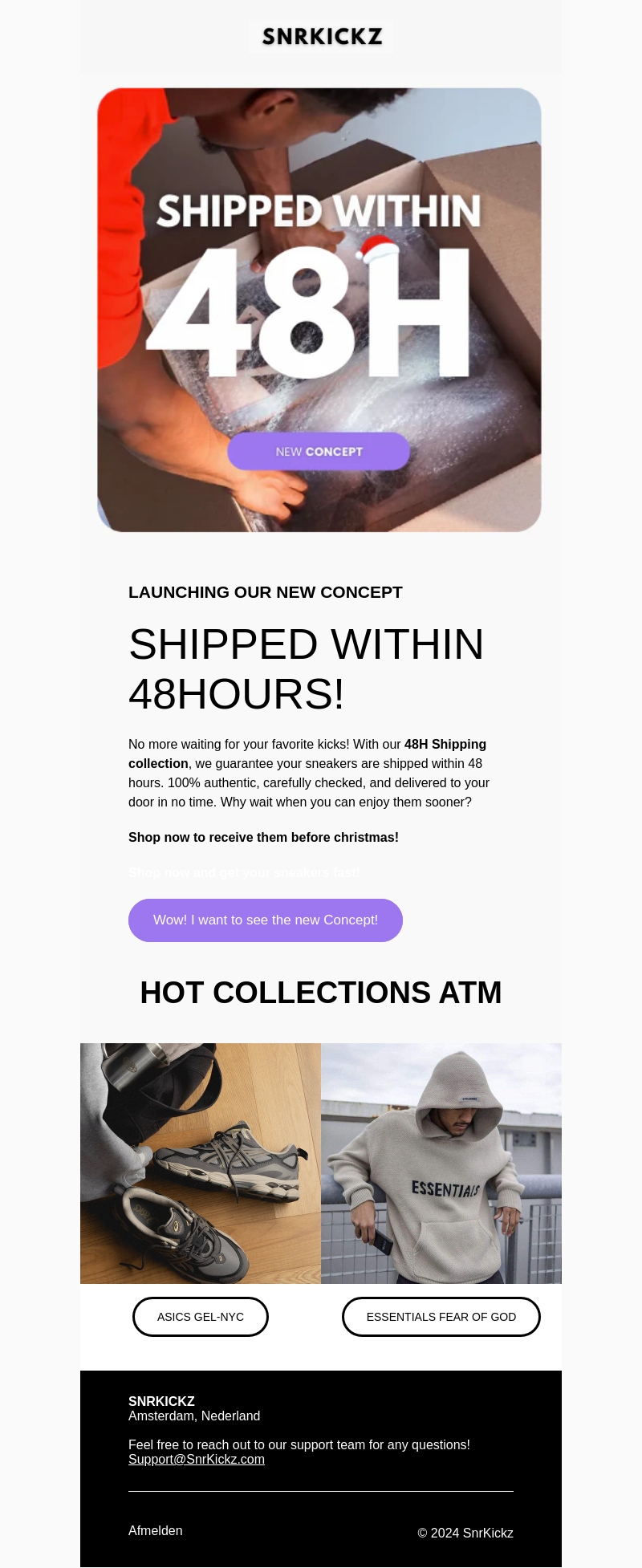 SnrkCkz lanceert een nieuw verzendconcept! Geniet van heerlijke sneakers binnen 48 uur aan uw deur geleverd. Authentiek, snel en gemakkelijk voor al uw favoriete stijlen. Mis geen moment en bestel vandaag nog om ze voor kerst te ontvangen!