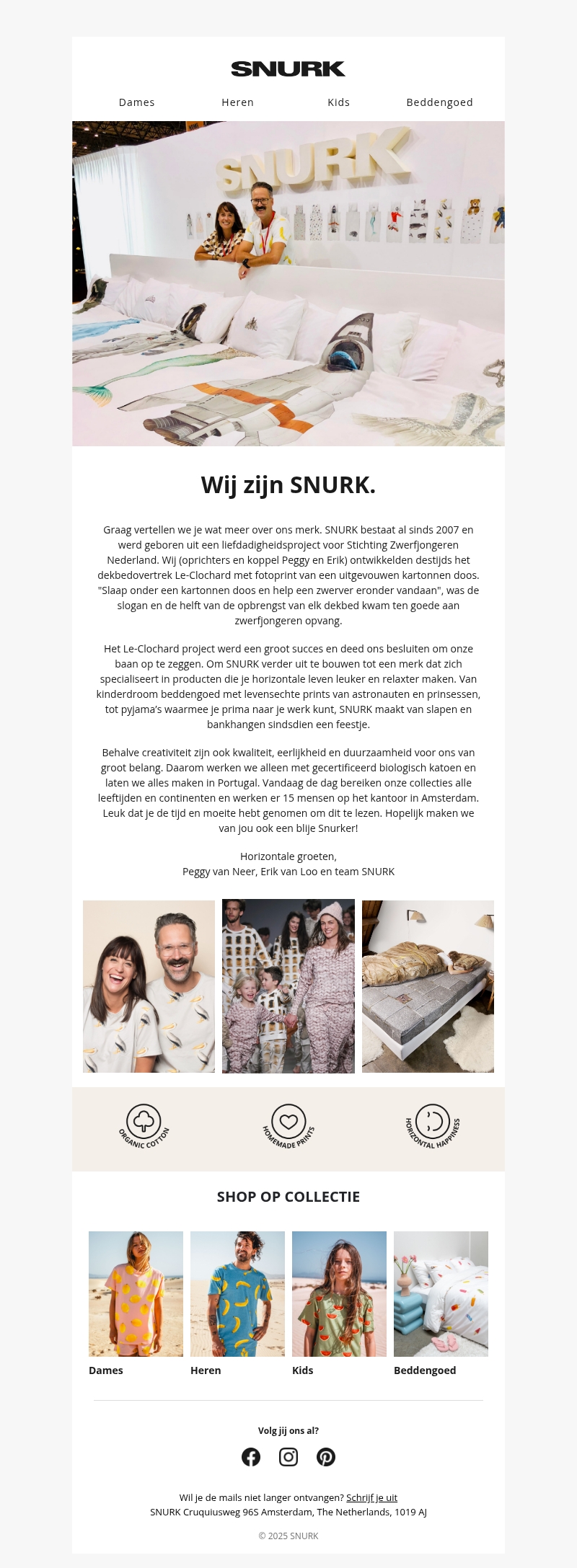 SNURK is een innovatief merk dat in 2007 begon als liefdadigheidsproject en nu bekendstaat om zijn creatieve bed- en nachtkleding. Van astronautenprints tot prinsessen, SNURK biedt unieke en levendige ontwerpen voor jong en oud. Met een focus op kwaliteit en duurzaamheid, wordt alles eerlijk geproduceerd in Portugal. Ontdek onze collecties voor dames, heren, kinderen en beddengoed.