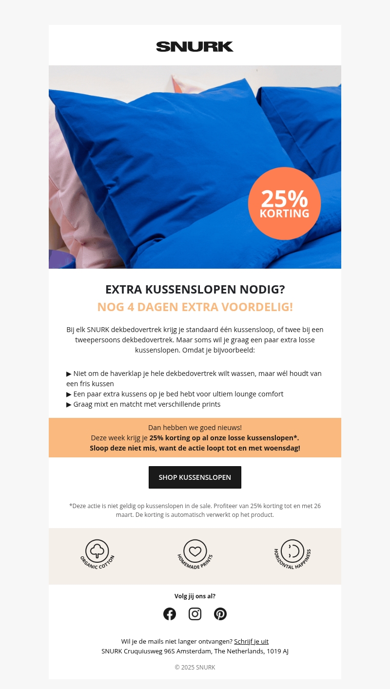 Ben je op zoek naar extra kussenslopen? Bij SNURK krijg je nu 25% korting op al onze losse kussenslopen. Ideaal voor het mixen en matchen van prints of voor wat extra comfort in bed. Wees snel, de actie loopt slecht vier dagen!