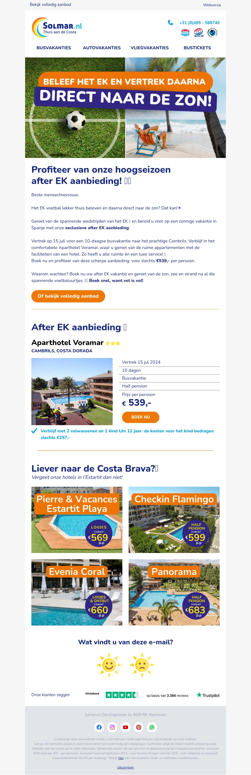 Beleef het EK en vertrek daarna direct naar de zon met onze exclusieve after EK aanbieding! Geniet van een 10-daagse busvakantie naar het prachtige Cambrils voor slechts €539 per persoon. Verblijf in een comfortabel aparthotel met luxe faciliteiten. Boek snel, want vol is vol!