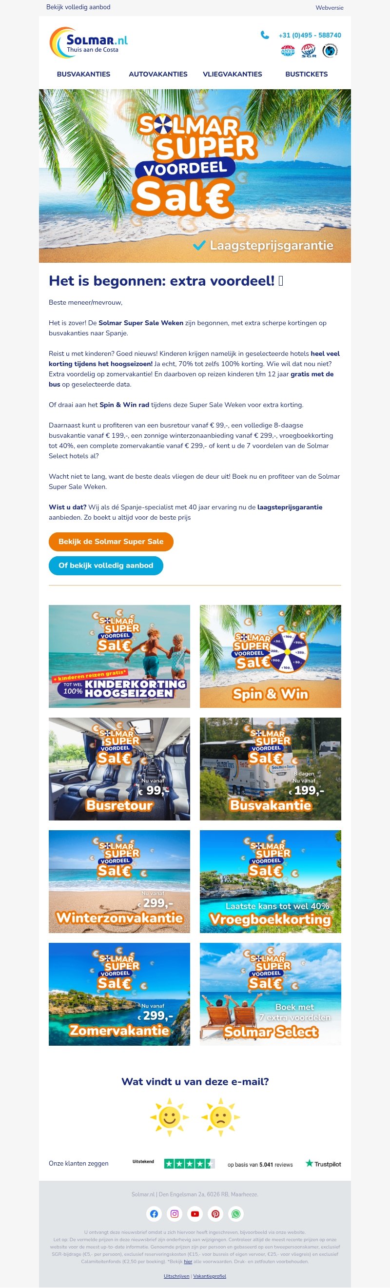 De Solmar Super Sale Weken zijn begonnen met extra scherpe kortingen op busvakanties naar Spanje. Kinderen reizen gratis en er zijn spectaculaire kortingen tot wel 100% voor geselecteerde hotels. Ontdek ook de extra voordelen via het Spin & Win rad. Mis deze kans niet en boek nu jouw voordelige zomervakantie!
