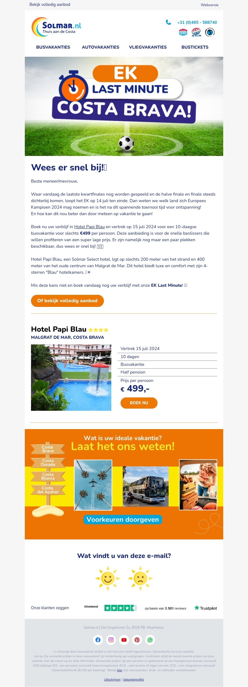Mis deze kans niet! Boek een 10-daagse busvakantie naar Hotel Papi Blau in Costa Brava voor slechts €499 per persoon. Dit exclusieve aanbod is perfect voor voetballiefhebbers en zonaanbidders die willen genieten van het EK 2024 terwijl ze ontspannen aan de kust. Wees er snel bij, want de plaatsen zijn beperkt!