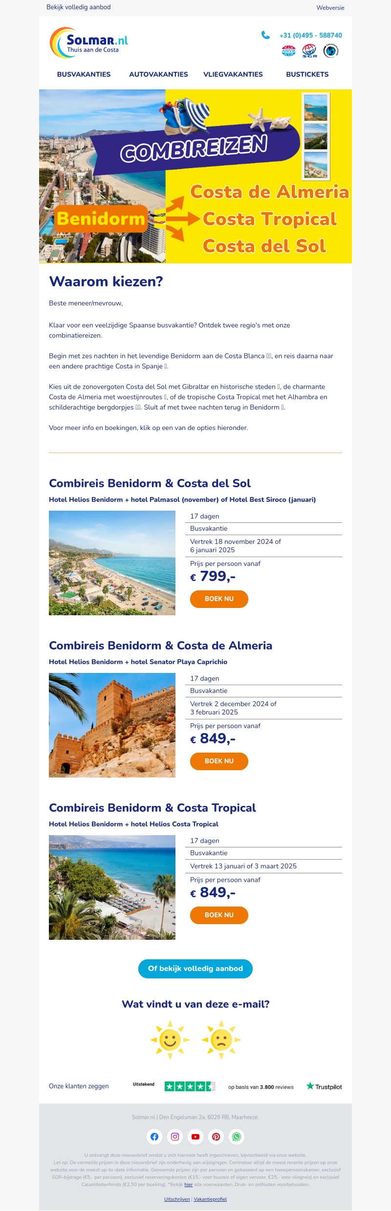 Ben je klaar voor een gevarieerde Spaanse busvakantie? Ontdek onze exclusieve combinatiereizen naar Benidorm en verschillende prachtige Costa's in Spanje. Bezoek de zonnige Costa del Sol, het historische Costa de Almeria en het tropische Costa Tropical. Boek nu jouw droomreis!