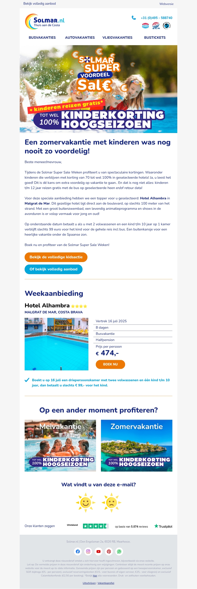 Beleef een zomer vol plezier met de Solmar Super Sale Weken. Unieke kortingen tot wel 100% voor kinderen in geselecteerde hotels. Boek nu het Hotel Alhambra in Malgrat de Mar met speciaal tarief. Een onvergetelijke vakantie voor het hele gezin, inclusief animatie en gratis verblijf voor kinderen t/m 12 jaar.