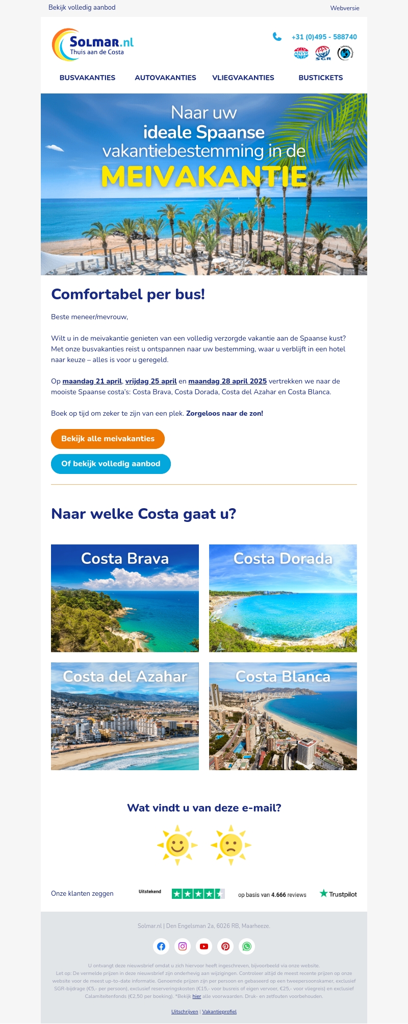 Bereid u deze meivakantie voor op een onvergetelijke reis naar de Spaanse kust met onze volledig verzorgde busvakanties. Reis comfortabel naar prachtige bestemmingen zoals Costa Brava, Costa Dorada, Costa del Azahar en Costa Blanca. Geniet van een zorgeloze vakantie met overnachtingen in luxe hotels. Boek nu uw plek en ontspan in de zon!