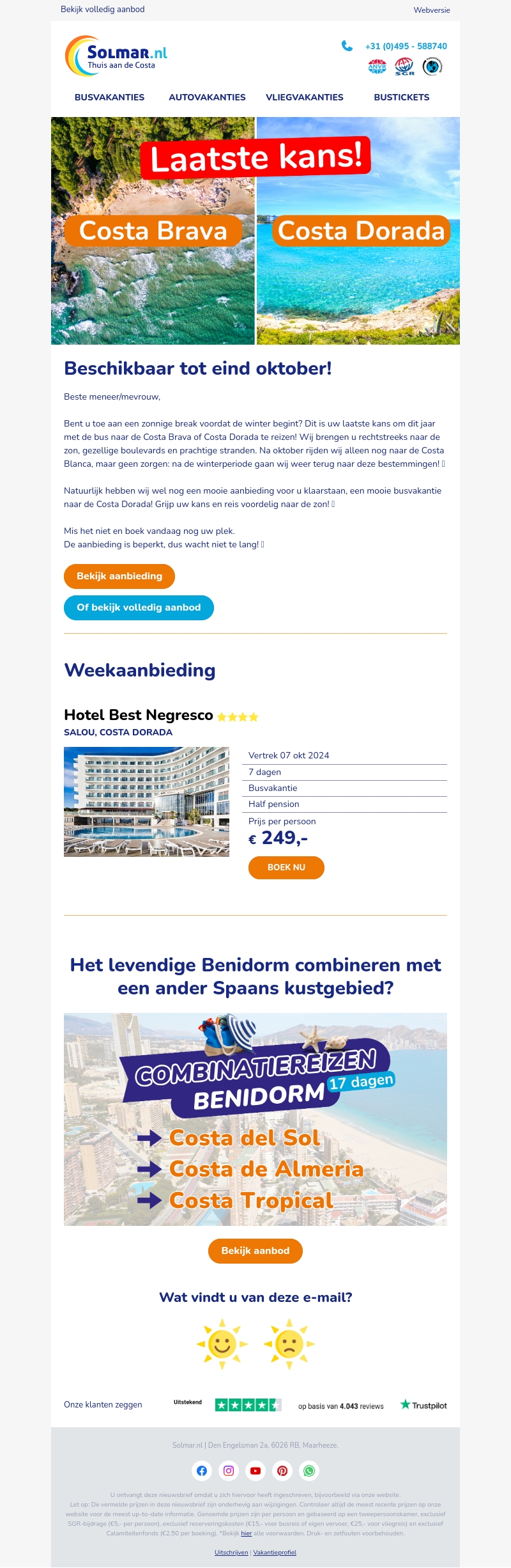 Boek nu uw heerlijke vakantie naar Costa Brava of Costa Dorada en geniet nog even van de zon voordat de winter begint. Onze bussen rijden tot eind oktober en de aanbieding is beperkt. Mis het niet en boek vandaag nog. Ontdek ook speciale weekaanbiedingen voor Hotel Best Negresco en combinatiereizen naar Benidorm.