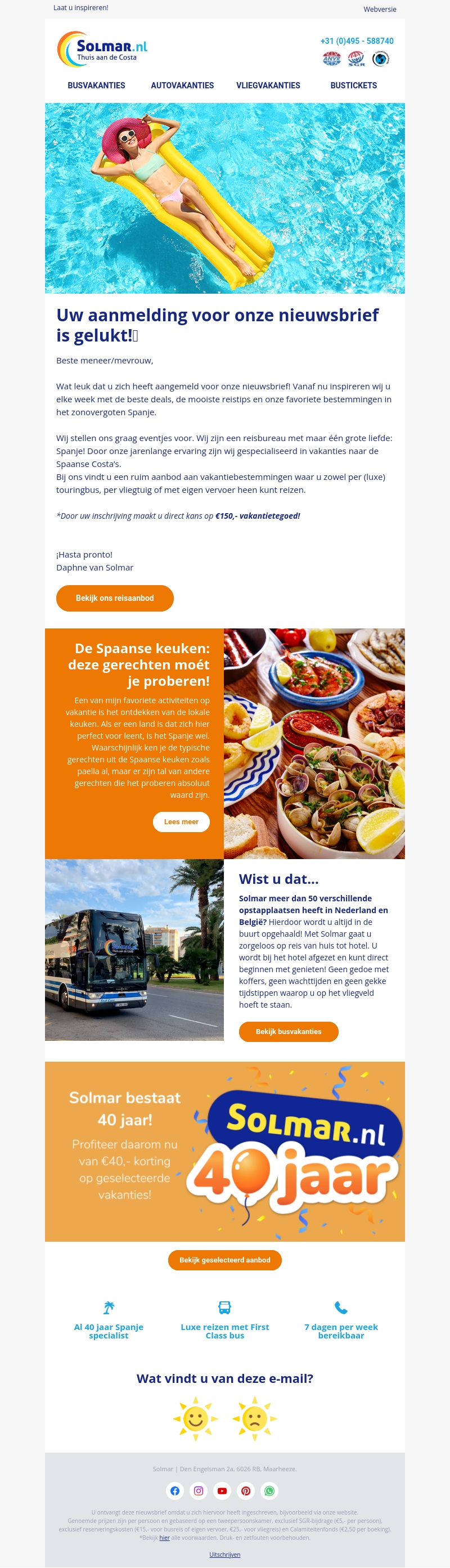 Leuk dat u zich heeft aangemeld voor onze nieuwsbrief! Vanaf nu krijgt u elke week de beste deals, reistips en favoriete bestemmingen van Solmar binnen. Door uw inschrijving maakt u direct kans op โฌ150,- vakantietegoed! Ontdek snel onze fantastische aanbiedingen naar Spanje.
