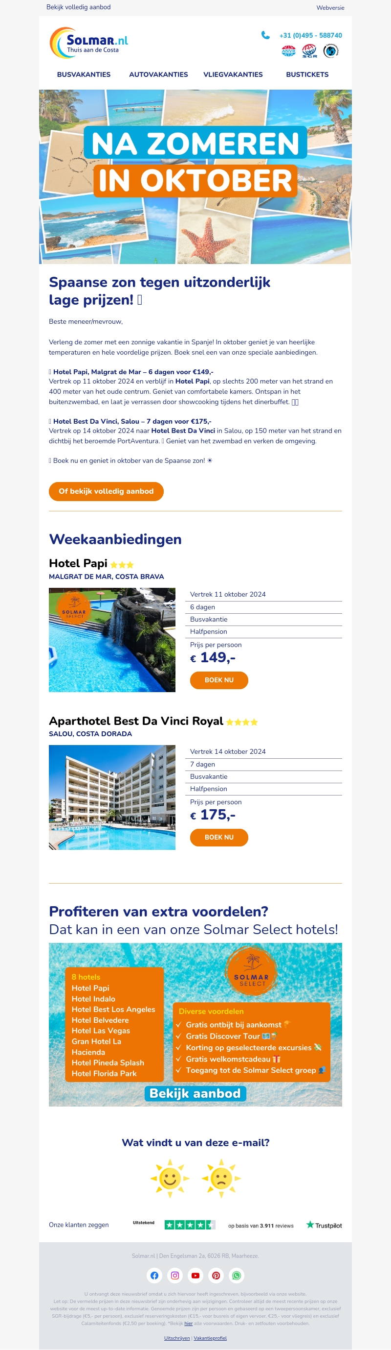 Verleng uw zomer met een zonovergoten vakantie in Spanje! Boek nu een van onze speciale aanbiedingen voor oktober en geniet van heerlijke temperaturen tegen voordelige prijzen. Ontdek onze toppers zoals Hotel Papi en Hotel Best Da Vinci Royal.