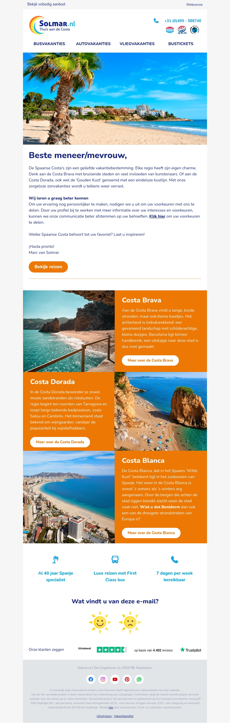De Spaanse Costa's zijn de perfecte vakantiebestemmingen voor liefhebbers van zon en zee. Van de levendige Costa Brava tot de gouden kusten van Costa Dorada en de serene schoonheid van Costa Blanca. Kom meer te weten over deze prachtige regio's die elk hun unieke charme hebben. Ontdek welke Spaanse Costa jouw favoriet zal zijn! Laat je inspireren door onze zorgvuldig uitgekozen vakanties.