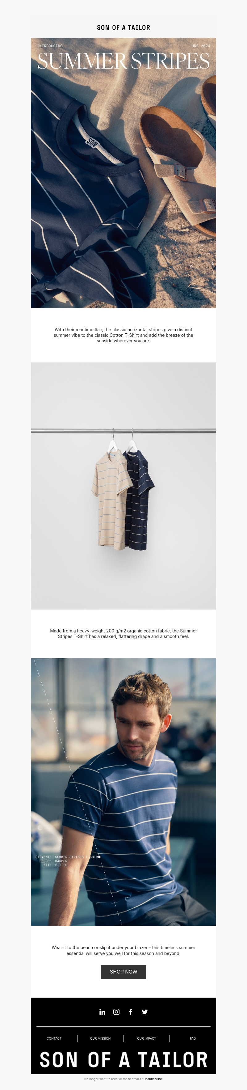 Maak kennis met de Summer Stripes T-Shirt van Son of a Tailor. Deze stijlvolle t-shirts zijn gemaakt van 200 g/m2 organisch katoen en bieden een ontspannen en flatterende pasvorm. Perfect voor een dagje strand of een zomerse avond uit. Verkrijgbaar in verschillende kleuren voor elke gelegenheid.