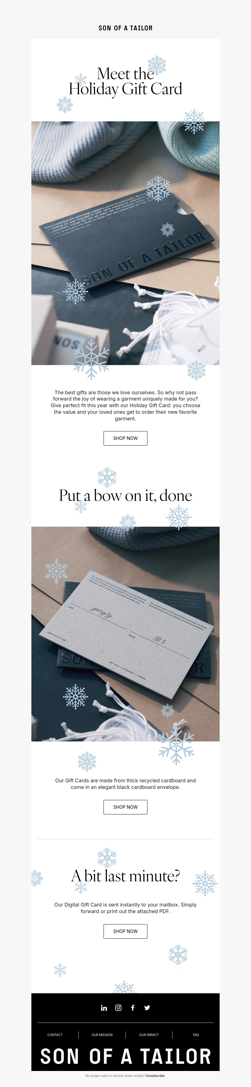 De beste cadeaus zijn persoonlijk. Met de Holiday Gift Card van Son of a Tailor kies je de waarde, zodat de ontvanger hun perfecte kledingstuk kan bestellen. Onze cadeaukaarten zijn gemaakt van gerecycled karton en worden geleverd in een elegante zwarte envelop. Het is een snel en stijlvol geschenk dat past bij iedere gelegenheid.