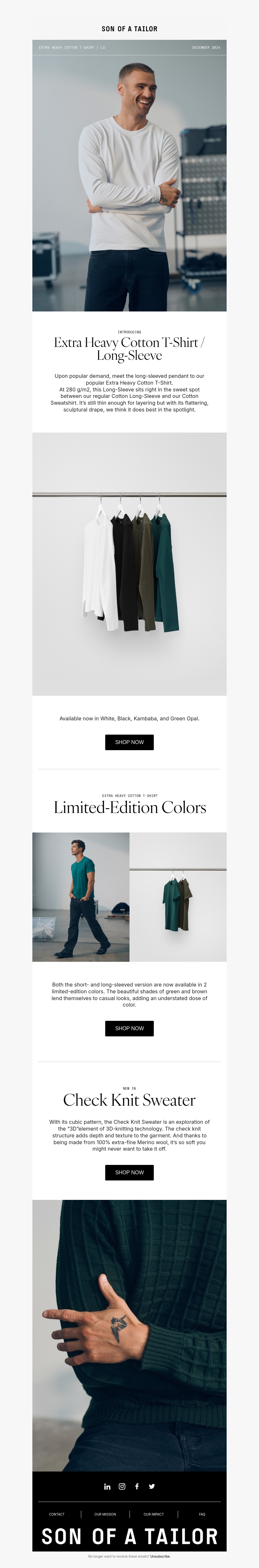 De extra zware katoenen longsleeve van Son of a Tailor is nu beschikbaar. Ideaal voor laagjes of gewoon op zichzelf, deze longsleeve heeft een flatterend silhouet. Verkrijgbaar in beperkte kleuren voor een subtiele stijluitstraling. Kies uit wit, zwart, kambala en groen opaal. Mis deze kans niet om je garderobe bij te werken.