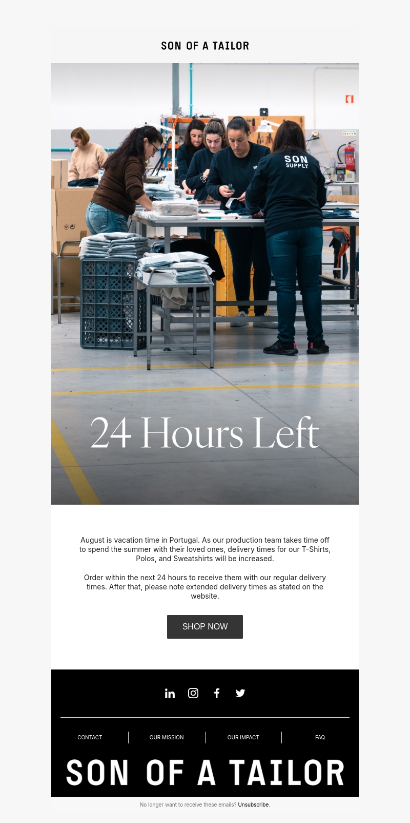 Onze productie in Portugal gaat met vakantie. Bestel binnen de komende 24 uur om je T-Shirts, Polo's en Sweatshirts met de reguliere levertijd te ontvangen. Daarna gelden langere levertijden.
