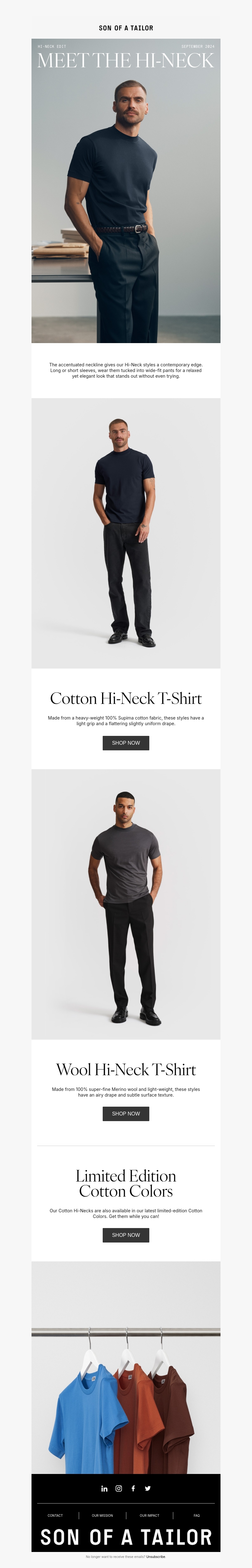 Ontdek de nieuwste Hi-Neck T-shirts van Son of a Tailor. Onze collectie bestaat uit hoogwaardige katoenen en wollen shirts, ontworpen om zowel stijlvol als comfortabel te zijn. Mis ook onze limited edition kleuren niet!