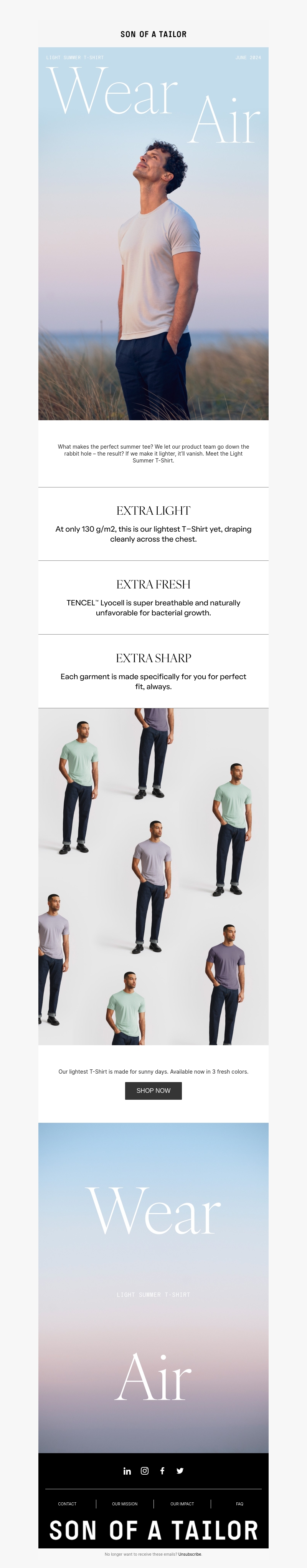 Ontdek de nieuwe lichtgewicht zomer T-Shirt van Son of a Tailor. Met slechts 130 g/m², gemaakt van ademend TENCEL™ Lyocell en ontworpen voor perfectie. Beschikbaar in 3 frisse kleuren voor ultiem zomercomfort.