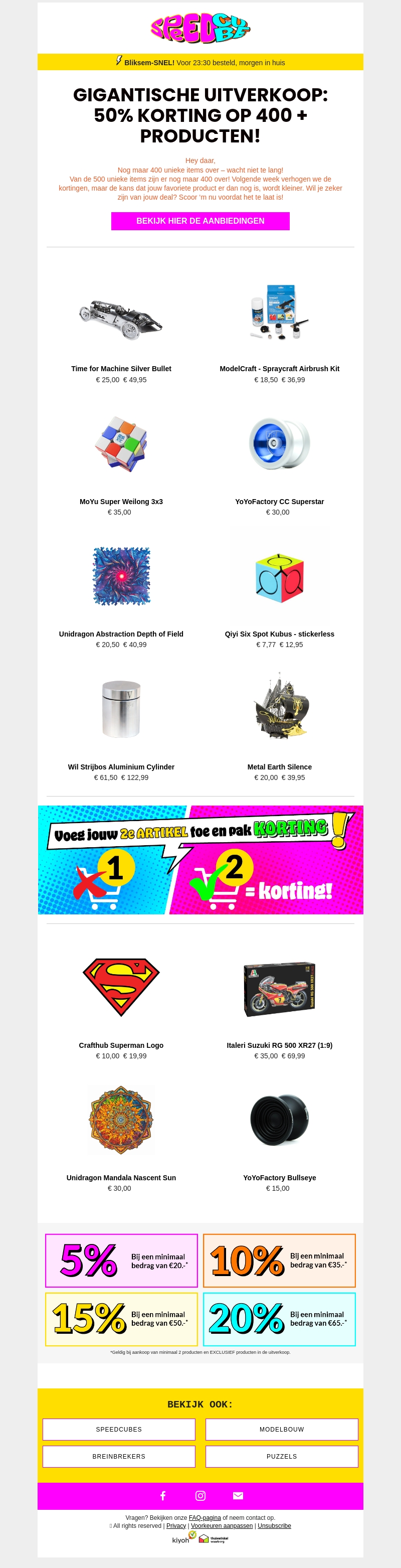 Profiteer van onze gigantische uitverkoop met 50% korting op meer dan 400 producten! Van speedcubes tot modelbouwsets, onze korting zorgt voor geweldige deals die je niet wilt missen. Voeg je favoriete items toe aan je winkelwagen en geniet van extra besparingen. Bestel snel, want deze aanbiedingen zijn tijdelijk!