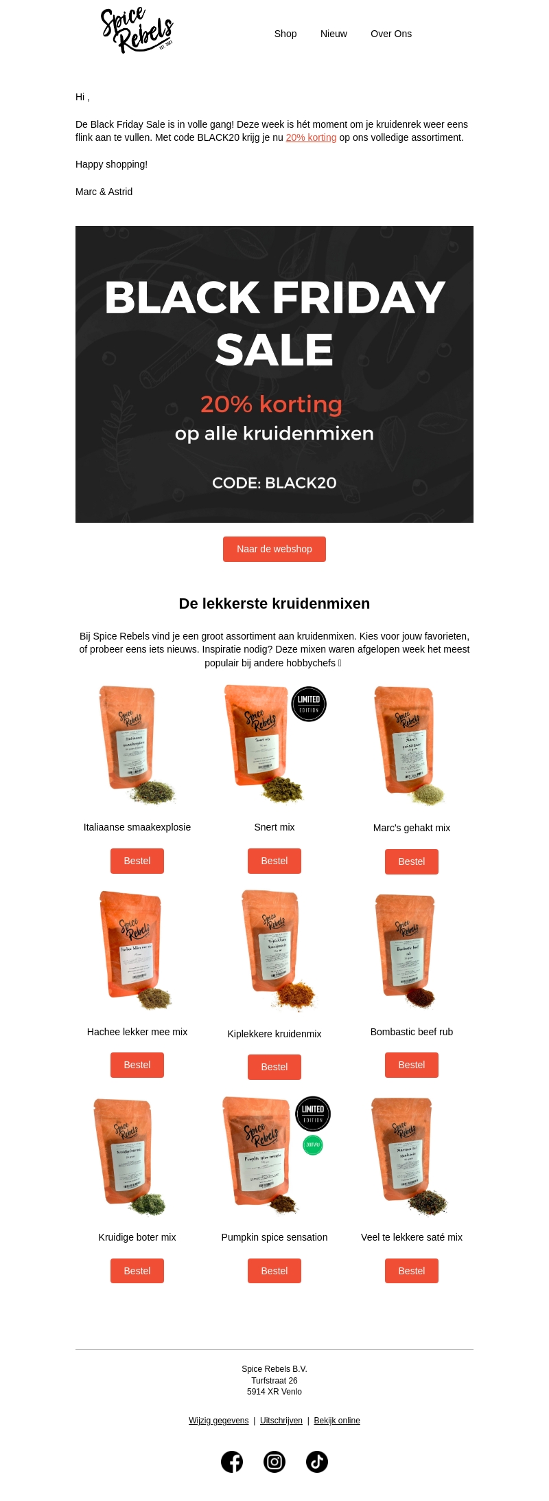 Ontdek de Black Friday Sale bij Spice Rebels! Krijg 20% korting op alle kruidenmixen met code BLACK20. Vul je voorraad aan met smaakvolle opties zoals Italiaanse smaakexplosie, kipkruiden en meer. Deze limited editions zijn populair bij hobbykoks. Profiteer snel van deze aanbieding!