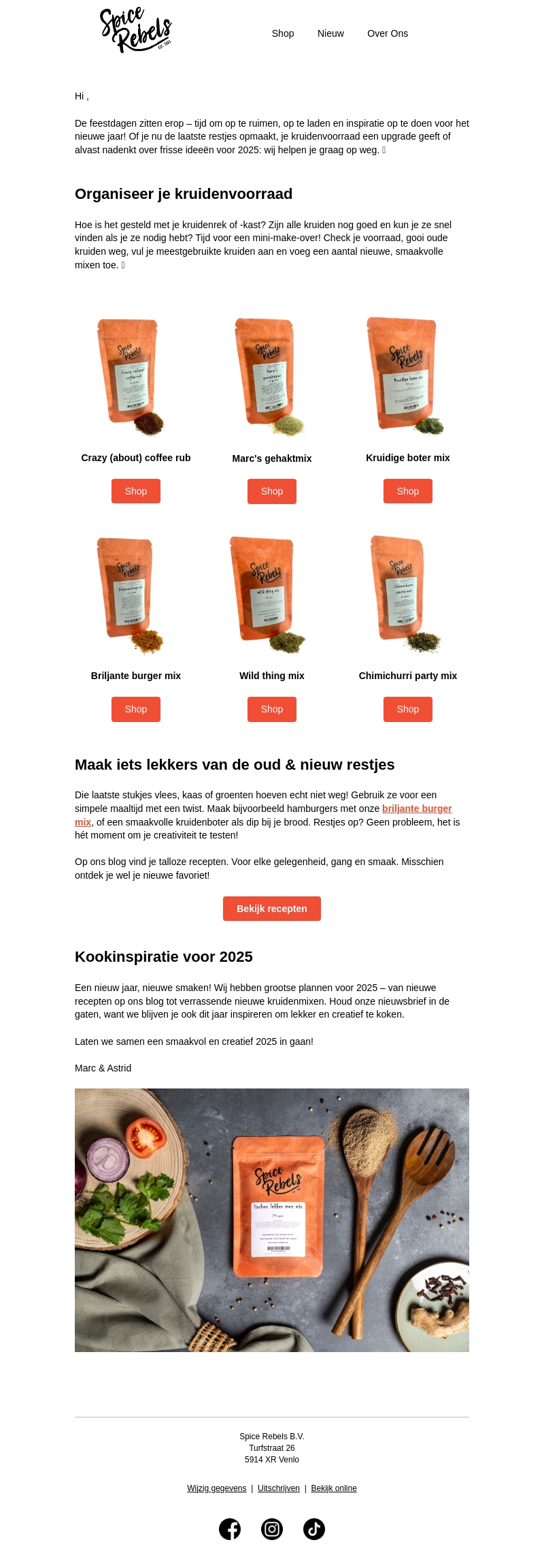 De feestdagen zijn voorbij en het is tijd voor een frisse start in je keuken. Organiseer je kruidenvoorraad met Spice Rebels en ontdek nieuwe smaken voor 2025. Gebruik de heerlijke kruidenmixen om restjes om te toveren tot smakelijke gerechten. Blijf geรฏnspireerd en creatief in het nieuwe jaar met onze verrassende recepten en mixen.