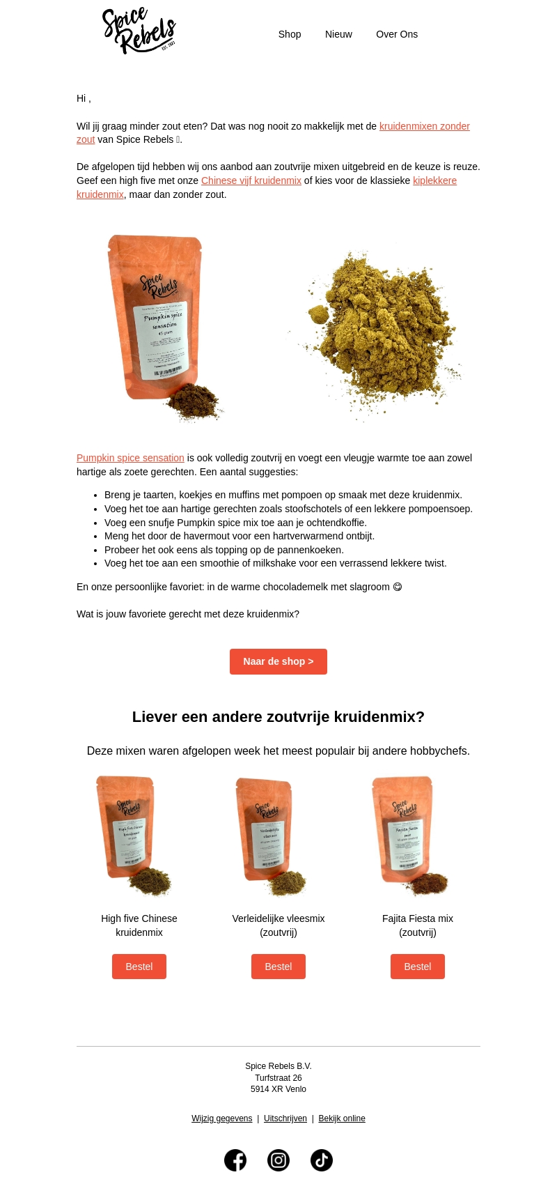 Wil je minder zout eten zonder in te boeten op smaak? Spice Rebels presenteert een assortiment zoutvrije kruidenmixen. Van Chinese vijfkruiden tot kipkerrie, je vindt de perfecte mix. Ontdek ook de veelzijdige Pumpkin Spice Sensation voor zowel zoete als hartige gerechten. Perfect voor taarten, koffie, en nog veel meer.