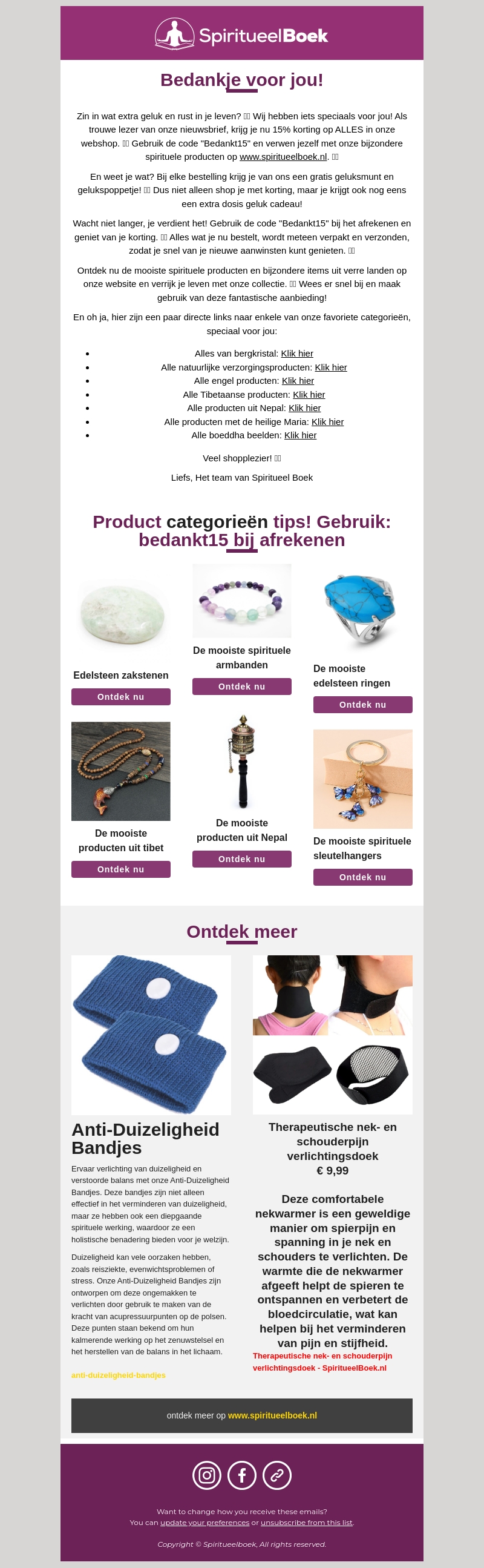 Wil je meer geluk en rust in je leven? Spiritueel Boek biedt nu 15% korting op alles in de webshop met de code 'Bedankt15'. Bij elke bestelling ontvang je gratis geluksmunten en een gelukspoppetje. Ontdek nu de mooiste spirituele producten en verrijk je leven!