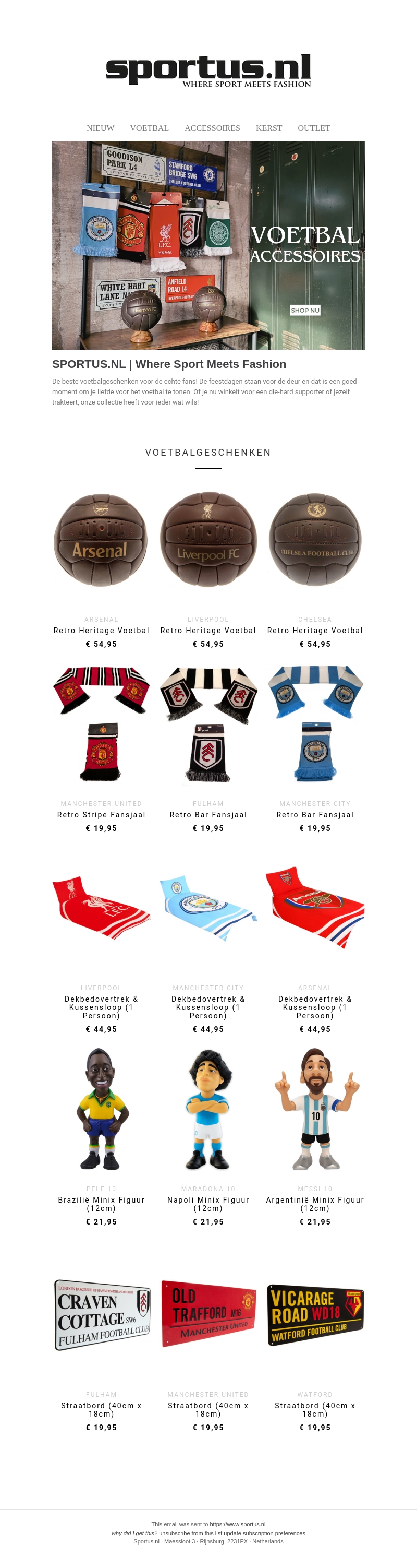 Ben je op zoek naar het perfecte cadeau voor een voetbalfan? Kijk dan niet verder! Bij Sportus.nl vind je een uitgebreide collectie van retro voetbalartikelen zoals heritage voetballen en fansjaals, ideaal voor de feestdagen. Maak indruk op je vrienden en familie met unieke items van hun favoriete clubs zoals Arsenal, Liverpool en Manchester United. Of het nu gaat om stijlvolle fansjaals of minix figuren van legendes als Pelé en Maradona, er is voor ieder wat wils.