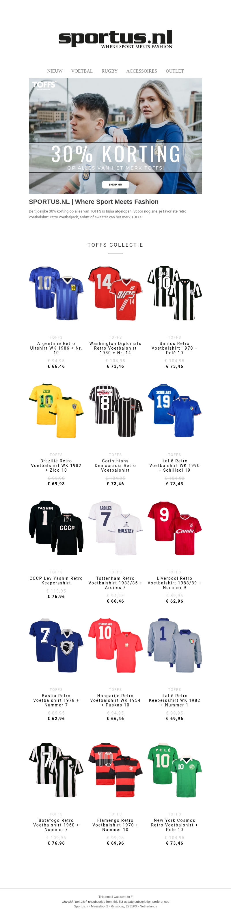 Profiteer nu van een exclusieve 30% korting op alles van TOFFS. Ontdek een breed assortiment van retro voetbalshirts, jacks en T-shirts van je favoriete teams en spelers uit het verleden. Deze tijdelijke aanbieding is bijna voorbij, dus wees er snel bij en voeg deze iconische items toe aan je collectie. Perfect voor iedere voetbalfan!