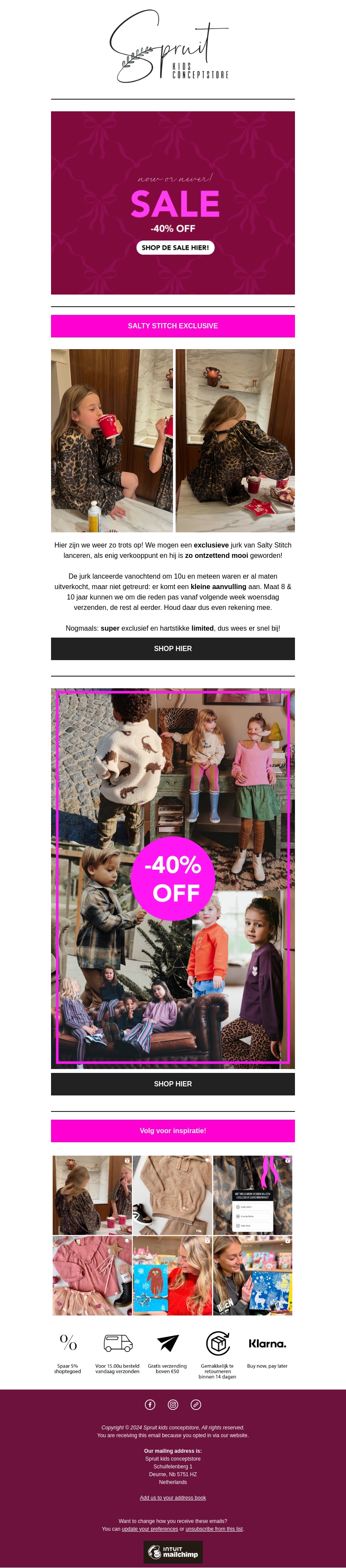 Profiteer van de tijdelijke actie bij Spruit Hub Conceptstore. Met de verhoogde korting van -40% vind je de mooiste kledingstukken voor de scherpste prijzen. Deze exclusieve aanbieding geldt op een selectie van unieke items, waaronder een speciale jurk van Salty Stitch. Wees er snel bij, want op is op! Shop gemakkelijk online en mis deze kans niet.