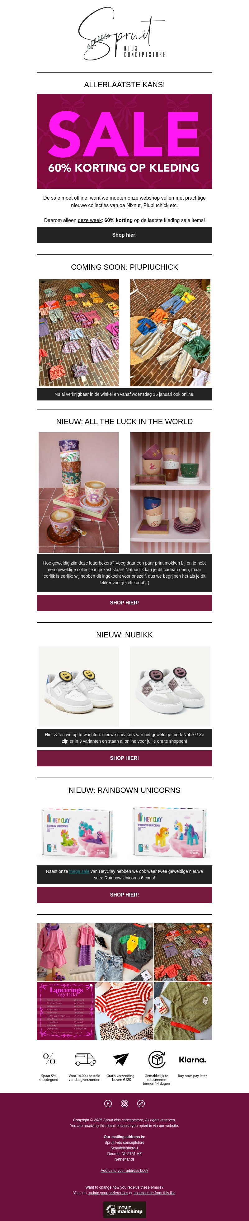 Ontdek de spectaculaire uitverkoop bij Spruit Kids Conceptstore met een korting van 60% op kledingstukken. Grijp deze allerlaatste kans en vernieuw je garderobe met nieuwe en unieke collecties. De sale moet plaatsmaken voor prachtige nieuwe items. Bezoek onze winkel en profiteer van deze unieke kortingen. Shop online of in de winkel voor de beste deals. Wees er snel bij!
