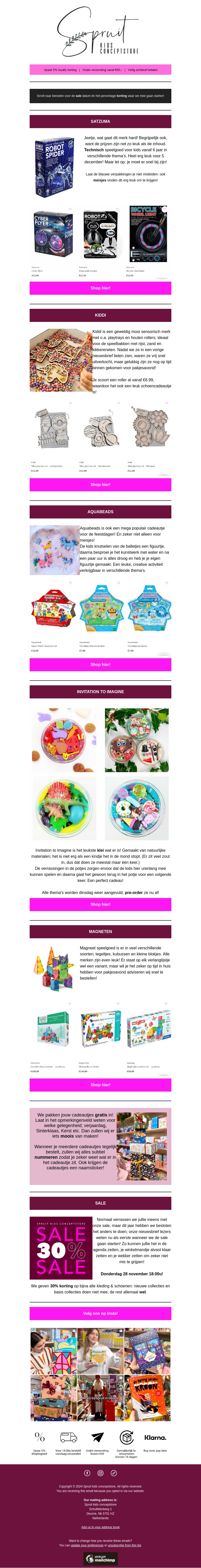 De nieuwsbrief van Spruit Speelgoed zit boordevol spannende aanbiedingen en cadeautips. Bereid je voor op de aankomende sale en ontdek een verscheidenheid aan creatieve en educatieve speelgoedopties. Mis de kans niet om te profiteren van de geweldige kortingen.
