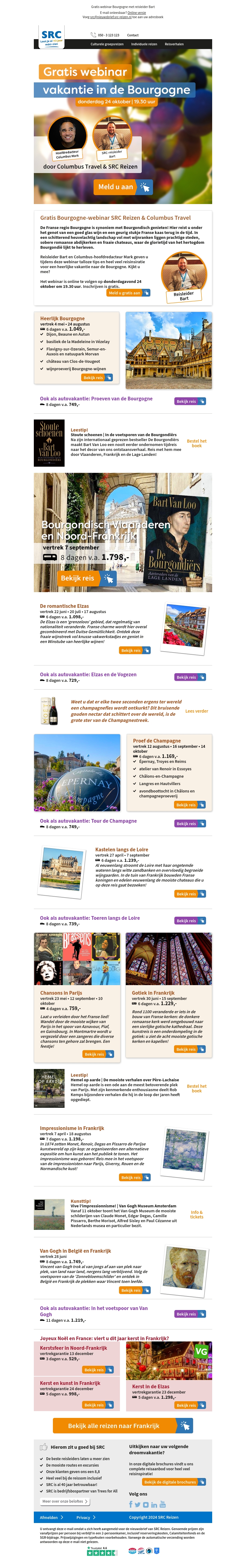 Beleef de magie van Bourgondisch Frankrijk met SRC Reizen en Columbus Travel. Geniet van gratis webinars, opvallende reisaanbiedingen en ontdek de mooiste plekken van Frankrijk. Mis de kans niet om de rijke cultuur en gastronomie van de Bourgogne en andere Franse regio's te ervaren. Boek nu je avontuur voor ongeëvenaarde herinneringen.